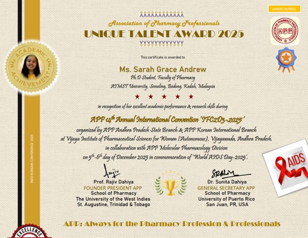 AIMST University proudly congratulates Ms. Sarah Grace Andrew, PhD Scholar, Faculty of Pharmacy, on her outstanding achievements at the APP 14th Annual International Convention & 3rd Indo-Korean Conference.