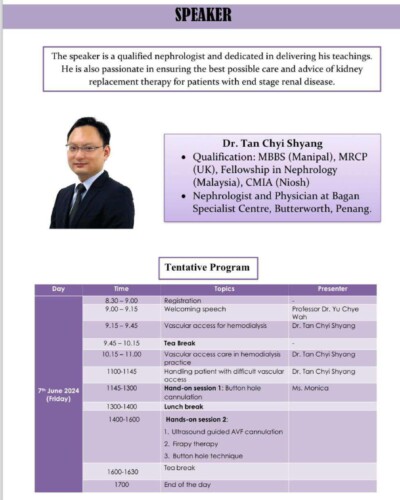 The workshop will feature Dr. Tan Chyi Shyang, a Nephrologist and Physician at Bagan Specialist Centre, Butterworth, Penang. He will share his extensive knowledge and expertise on the management of vascular access in hemodialysis, aiming to enhance participants’ skills and proficiency in this critical area.