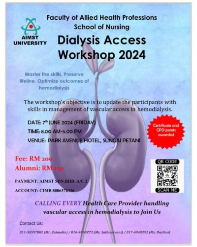 AIMST University’s Faculty of Allied Health Professions (FAHP) is delighted to invite you to the Dialysis Access Workshop 2024. This comprehensive workshop is scheduled to take place on 7th June 2024 (Friday), from 8 am to 5 pm at the Park Avenue Hotel in Sungai Petani.